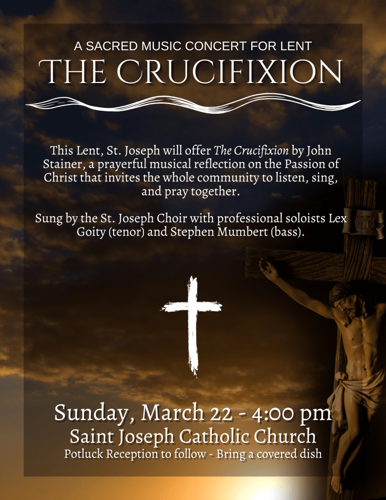 On Sunday, March 22 at 4:00 PM, the St. Joseph Choir will present The Crucifixion by John Stainer, a profound and prayerful work of sacred music written specifically for the Lenten season. Through scripture, hymnody, and choral meditation, this concert invites the entire community to listen, sing, and pray together as we journey toward Holy Week.